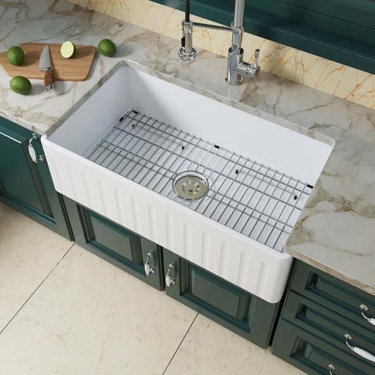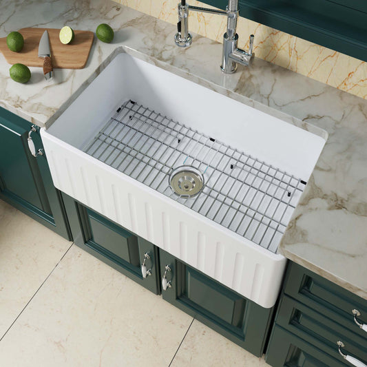 33" X 20" White Fireclay Single Bowl Farmhouse Apron Front Kitchen Sink with Strainer and Sink Protector Grid