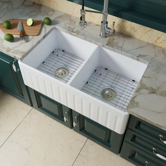 33" X 18" WHITE FIRECLAY DOUBLE BOWL FARMHOUSE APRON FRONT KITCHEN SINK WITH STRAINERS AND SINK PROTECTOR GRID